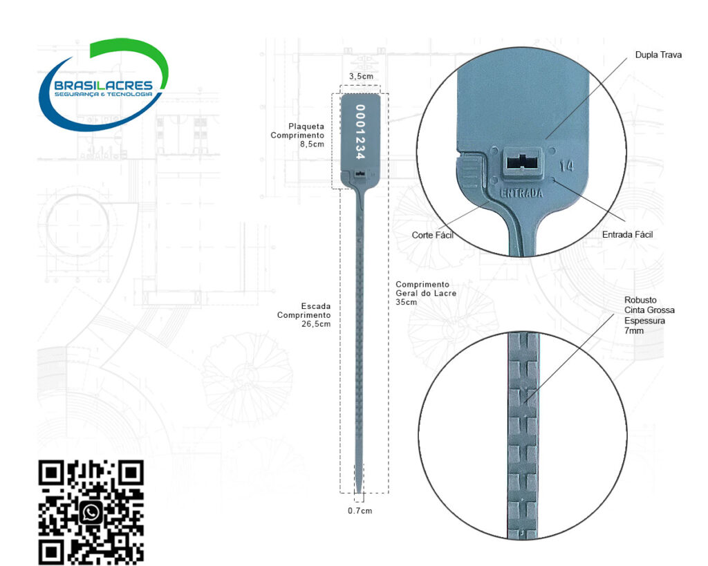 Lacre em plástico Polipropileno matéria- prima 100% virgem de origem Nacional e de acordo com a normativa Européia ROHS (livre de substância pesadas nocivas á saúde) com resistência térmica de 40º c a + 85º c que garante qualidade, praticidade, flexibilidade e resistência a tração nas suas diversas aplicações, com ótimas propriedades mecânicas e sem necessidade de ferramenta de aperto / fechamento.
